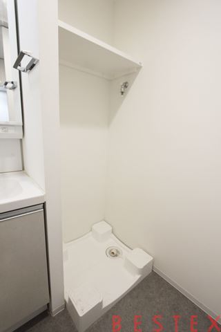 洗濯機置き場になります。上部に棚があるので洗剤などの収納に使えるのは便利ですね!