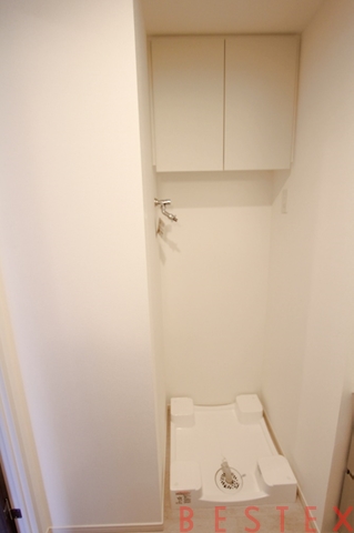 洗濯機スペースも脱衣所にあり、上部には収納も完備しております。