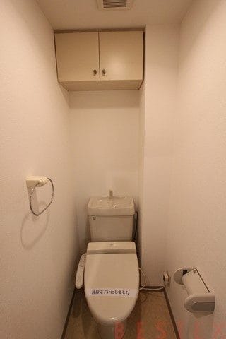 まずはトイレから。温水洗浄便座付きで、上には吊戸棚もあります。個人的にはこの収納が有るか無いかでは大違いだと思います。