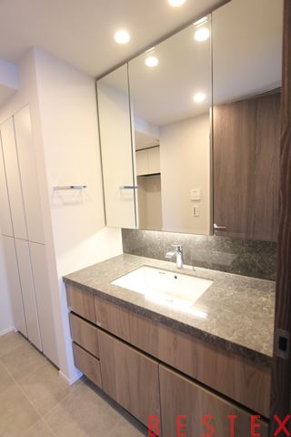 独立洗面台はサイズも大きく使いやすそうです。3面鏡付の収納たくさんです!