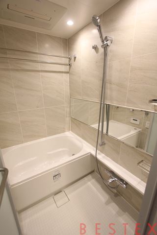 バスルームは広いだけでなく、石タイル調の高級感のある空間です。