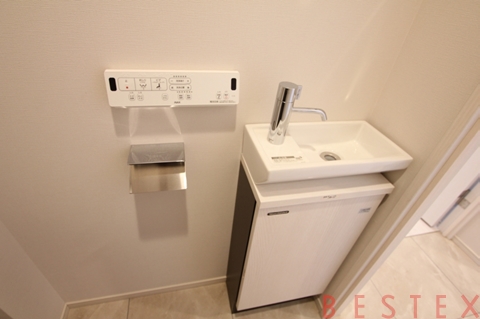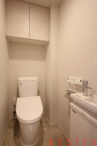 トイレはウォシュレット付きなのはもちろん、上部には収納もついており便利です。