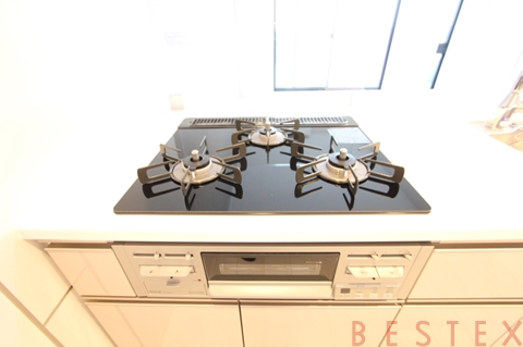 コンロは3口・グリルがついております。お手入れのしやすさと高級感が両立できるガラストップを採用しております。