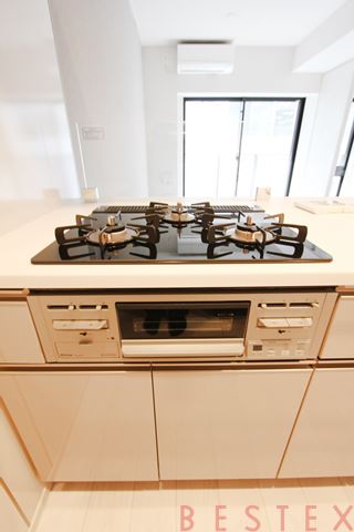 3口ガスコンロとグリル付きです。