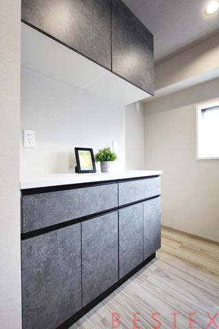 背面にはカップボード・冷蔵庫置き場がございます。