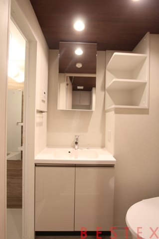 棚付きの独立洗面台があり、朝の身支度などに便利です♪