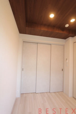 奥の洋室は天井クロスがダークな木目調となっており、高級感を感じる色合いです。