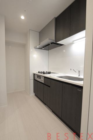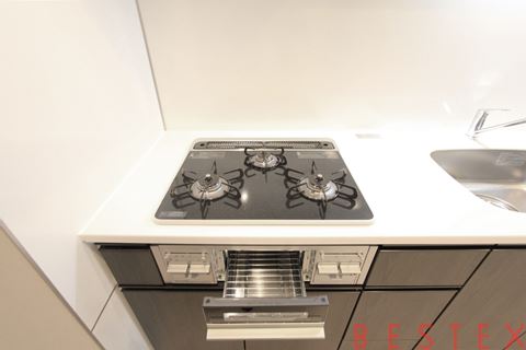 キッチンは3口ガスコンロ付きのシステムキッチンを採用しており、日々の料理も快適に。収納スペースもしっかり設けられているため、お部屋をすっきりと保ちながら生活できます。新築ならではの清潔感と設備の充実度も魅力のひとつです。