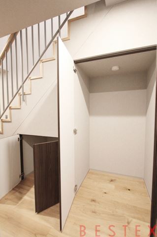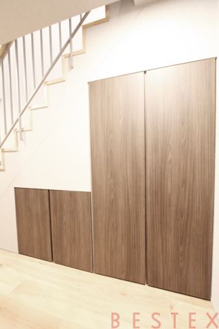 こちらの収納はペット用品やアウトドアグッズを収納するのに便利なスペース。