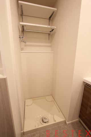 洗濯機置き場もあります。洗面台である程度手洗いをした服をそのまま洗濯機に入れられます。洗濯機置き場の上部にラックがあるのが便利!洗濯が終わればすぐに浴室乾燥機を使えるのもGOOD