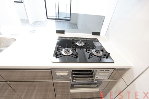 コンロはやっぱり使い勝手の良いガスコンロ!しっかり3口あります。普段の家族への料理にもホームパーティーにも大活躍です。グリル付きですので焼き魚も気軽に楽しめます。