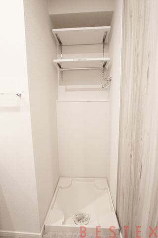 洗濯機置き場もあります。洗面台である程度手洗いをした服をそのまま洗濯機に入れられます。洗濯機置き場の上部にラックがあるのが便利!洗濯が終わればすぐに浴室乾燥機を使えるのもGOOD