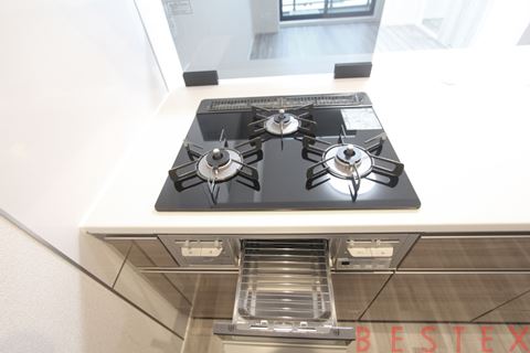 コンロはやっぱり使い勝手の良いガスコンロ!しっかり3口あります。普段の家族への料理にもホームパーティーにも大活躍です。グリル付きですので焼き魚も気軽に楽しめます。