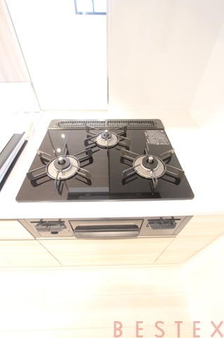 3口ガスコンロ、グリル付きのキッチンです。ガラストップなのでお手入れもしやすそうです!