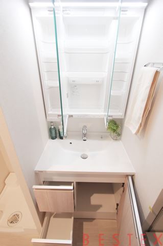 三面鏡仕様の独立洗面台で収納スペースもしっかり確保しております。