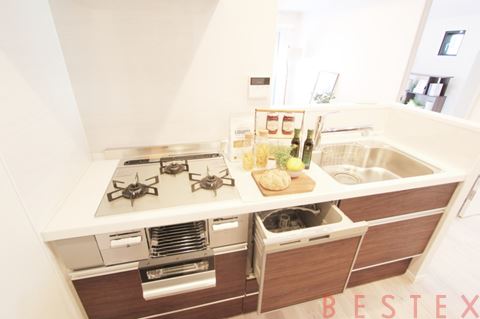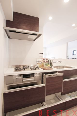 3口ガスコンロの対面式のキッチンで調理スペース・収納スペースも十分に確保されております。