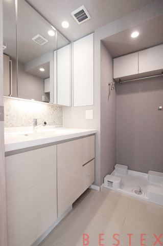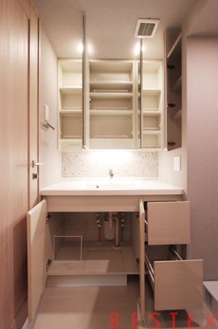 独立洗面台は三面鏡仕様で収納スペースが豊富です。