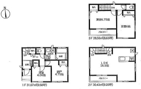 3階には6.75帖と6.0帖の洋室が2部屋がございます。