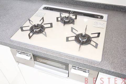 居住空間の中心となる約13.4帖の広々としたLDKには、寒い季節も足元から温めてくれる床暖房を完備。リビングを見渡せるL字型のカウンターキッチンは、3口ガスコンロ・グリル、さらにビルドイン食洗器を搭載した充実の仕様です。背面にはカップボードや冷蔵庫置き場も確保されています。