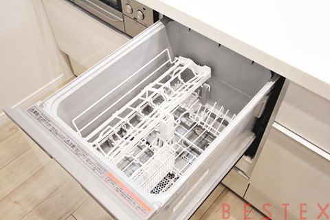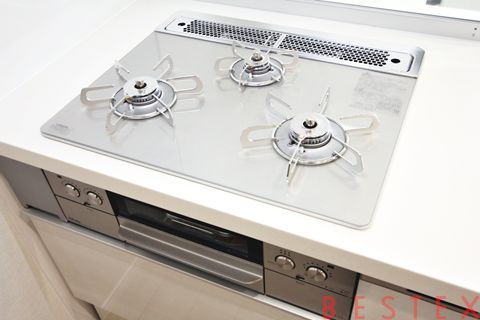 居住空間の核となる約12.0帖のLDKは、おしゃれなダウンライトが室内を優雅に照らし、洗練された雰囲気を演出しています。キッチンには、家族との会話が弾む人気のカウンターキッチンを採用しており、3口ガスコンロやグリル、家事の時間を短縮できるビルトイン食洗機、浄水器一体型水栓など、分譲仕様の機能的な設備が揃っています。また、LDKに隣接する3つの洋室(約5.0帖、約4.0帖、約5.0帖)は、すべてのお部屋にクローゼットが設置されており、収納力も抜群です。