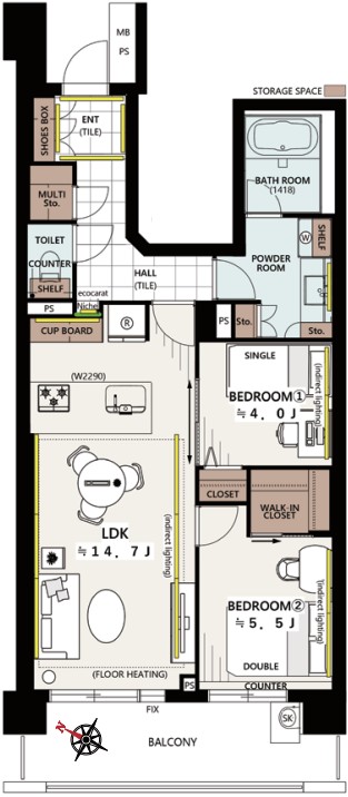 居室は、約5.5帖と約4.0帖の2部屋があり、メインの洋室には大容量のウォークインクローゼット(WIC)を完備。玄関部分にはシューズボックスだけでなく、マルチ収納(マルチクローク)やストレージスペースも設けられており、収納力が非常に高い設計です。