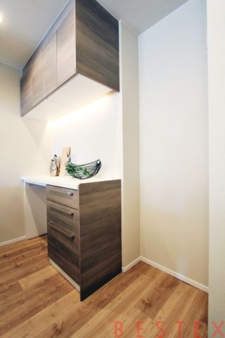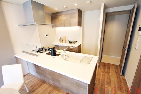 約14.7帖のLDKは、西向きのバルコニーに面しており、日当たりが良好です。リビング・ダイニング部分には床暖房を完備し、さらに効果的に配された間接照明やエコカラットが洗練された空間を演出しています。キッチンは家事の負担を軽減するビルトイン食洗機や浄水器を標準装備した人気のカウンタータイプを採用しており、背面にはカップボードも備え付けられています。