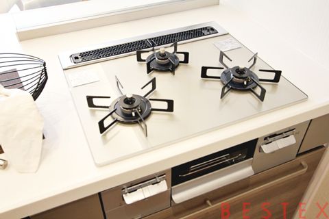 3口ガスコンロ・グリル搭載。