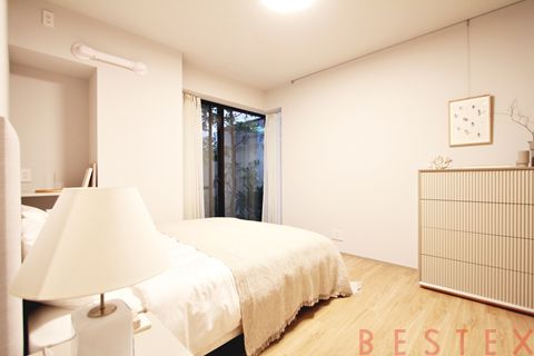 寝室は、約10.1帖のメインベッドルームと約4.4帖の洋室の2部屋を配置しています。メインベッドルームには広々としたウォークインクローゼットやデスクワークに最適なスペースが設けられているほか、こちらのお部屋にもインターホンが設置されています。水回りも一新されており、窓付きで開放感のあるバスルームには浴室暖房乾燥機を搭載し、三面鏡付きの独立洗面台や温水洗浄便座付きトイレを完備しています。西洋風のデザインが印象的な玄関には大型のシューズボックスを備え、さらに住戸外には38.63㎡の広大な専用庭が広がる、ヴィンテージマンションならではの贅沢な内装仕様となっています。