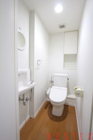 お手洗いはウォシュレット完備です♪収納棚もしっかり確保!