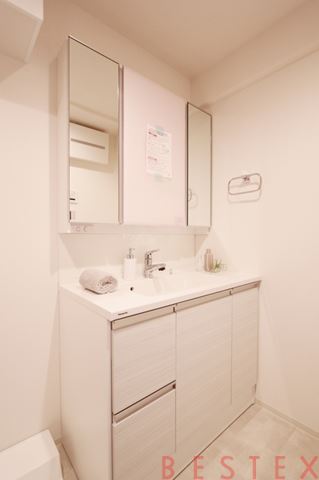 独立洗面台も三面鏡仕様で鏡の内側や洗面台下に収納スペースがございます。