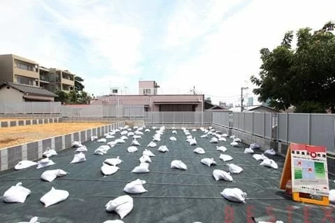 敷地奥側からの写真です。今回の敷地はシートの掛かっている部分になります。