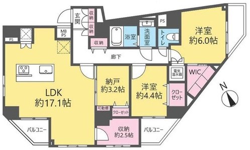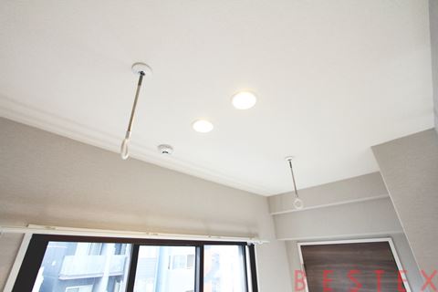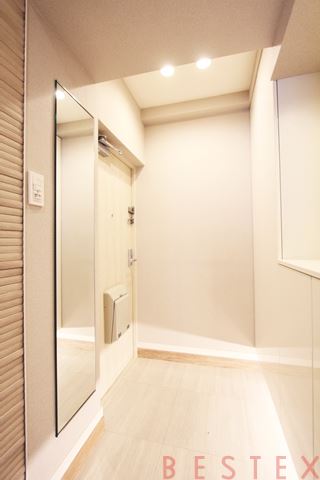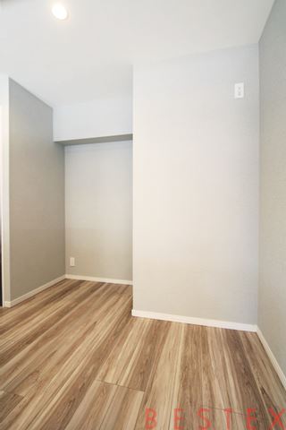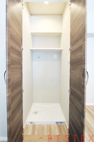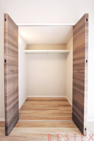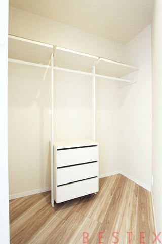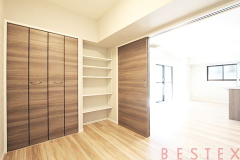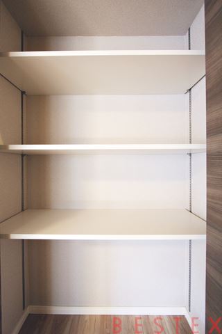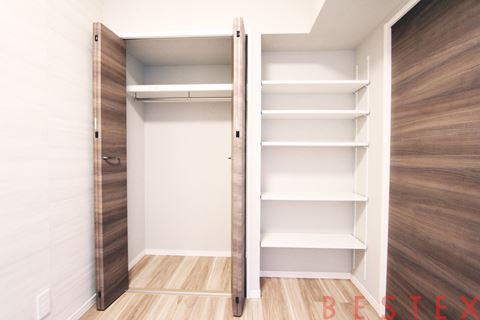 収納力の高さも本物件の特筆すべき点です。玄関には姿見付きのシューズクローゼット、約6.0帖の東側ベッドルームには大型のウォークインクローゼットを完備。その他、廊下の大型収納や、表記上は納戸ながら書斎・寝室として活用できる約3.2帖のサービスルームにも棚状収納とクローゼットがあり、居住空間をすっきりと保てます。室内干しが可能なスペースもあり、日々の暮らしの細部まで配慮された設計です。