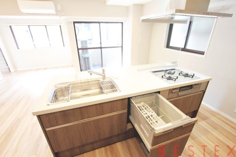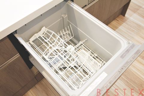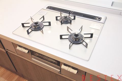 まず目を惹くのは、ご家族の会話が弾む人気のアイランドキッチン。3口ガスコンロ・グリル、ビルトイン食洗器を搭載し、広々としたシンクと十分な背面スペース(冷蔵庫・カップボード設置可)で、料理の時間を豊かに彩ります。利便性の高い洗濯機置き場も同スペースに配置されています。
