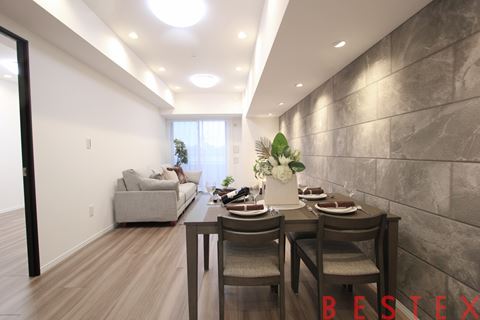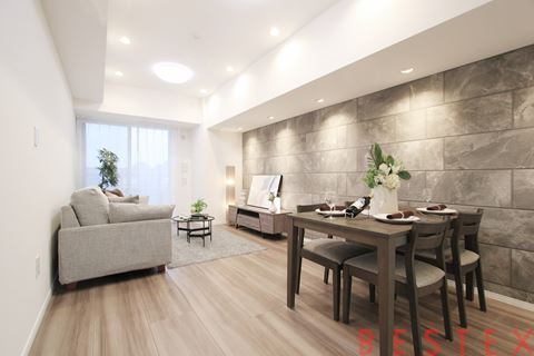 上質な素材とデザインにこだわった洗練の1LDK住戸です。リビング・ダイニング(約11.7帖)は重厚感のある石調タイルと間接照明が調和し、まるでホテルのラウンジのような落ち着いた空間を演出。大きな窓からはスカイツリーを望むことができ、開放感あふれる眺望が魅力です。