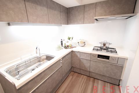 キッチン(約4帖)は食洗機・浄水器付きのシステムキッチンを新設し、L字型で調理スペース・収納スペースも十分に確保されており機能性とデザイン性を両立しております。