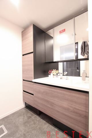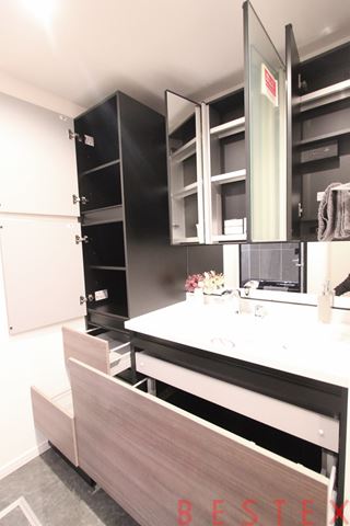 三面鏡仕様の独立洗面台で収納力もしっかりと確保されております。