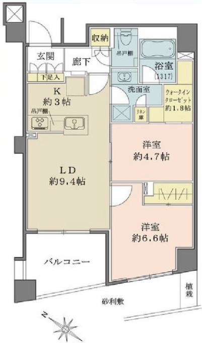 間取りは、南西向きバルコニーを持つ2LDK。約9.4帖のLD(リビング・ダイニング)は開放感があり、隣接する約5.6帖の洋室との間仕切りを開放すれば、一体的な広々とした空間としても利用可能です。リビング・ダイニングには床暖房が完備されており、冬でも足元から暖かく過ごせます。