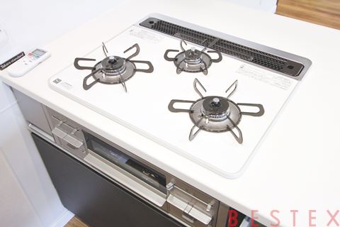 3口ガスコンロ・グリル搭載。