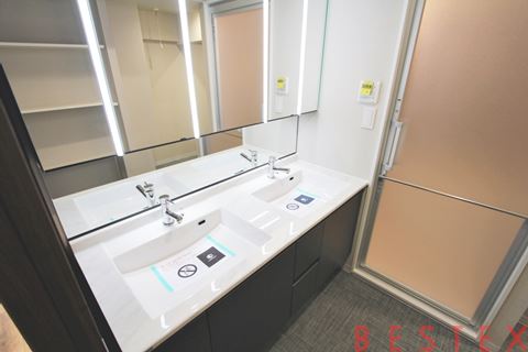 水回り設備は特にハイクラスです。洗面台には多面鏡のツーボウル独立洗面台を採用し、朝の忙しい時間も快適です。広々設計のバスルームには追い焚き機能と浴室乾燥機を搭載。パウダールームでは室内干しも可能です。また、大容量のシューズボックスや廊下収納、各洋室のクローゼットなど、収納の充実度も特筆すべき点です。