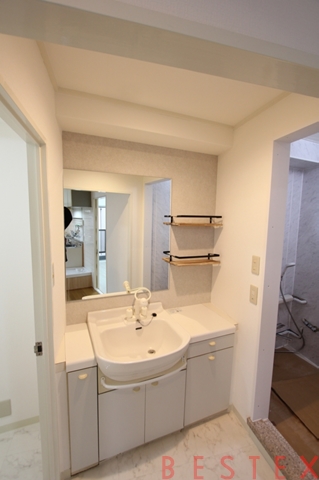 独立洗面台は棚が一体型になっており、非常に広く、同時に2人お使い頂けるサイズでございます!