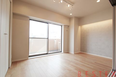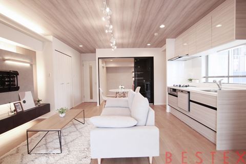 約19.1帖のゆとりあるLDKは、大きな開口部からたっぷりと自然光が差し込み、都心とは思えない明るく開放的な空間です。天井にはダウンライトとライティングレールを設け、洗練された雰囲気を演出。キッチンは使い勝手の良いカウンタータイプで、家事動線もスムーズです。
