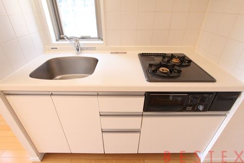 キッチンはガスコンロが二口と魚焼きグリルが付いておりますので、お料理も捗りそうです♪