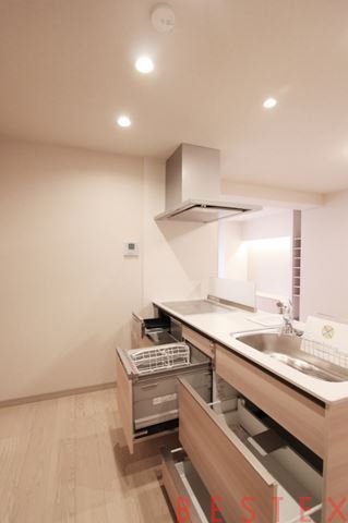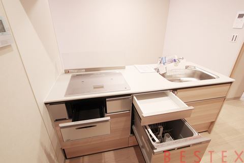 キッチンは、日々のお料理を効率的に楽しめるシステムキッチンを新規に交換いたしました 。家事の負担を大幅に軽減する食器洗い乾燥機を新たに設置し、デザイン性と機能性を両立 。リビングを見渡しながら調理ができる開放的な設計で、家族やゲストとの会話を愉しみながら家事を進めることができます 。