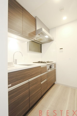 居住空間のメインとなるリビング・ダイニング(LD)は約7.2帖の広さがあり、南向きのバルコニーに面しているため、豊かな自然光が差し込む明るい空間となっています。室内は、本質繊維を原料とする成型板に木目調の樹脂シートを貼った「シートフローリング」仕様となっており、お手入れのしやすさと木の温もりを両立させています。キッチンは約2.5帖の独立したスペースにあり、料理の効率を高める3口ガスコンロとグリルを完備したシステムキッチンを採用しています。
