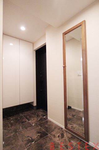 姿見鏡のある玄関でお出かけ前に容姿の確認ができます。