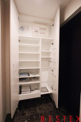 シューズボックスには傘立てがあり、棚の取り外しや高さ調節も可能となっております。