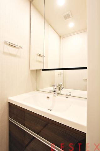 サニタリー空間は、分譲マンションならではのハイグレードな仕様です。独立洗面台は二面鏡付きの機能的なデザインで、バスルームには追い焚き機能や浴室換気乾燥機を完備しています。トイレは空間を広く見せるタンクレストイレを採用し、手洗い場も独立して設置されているため、清潔感と高級感を感じさせます。