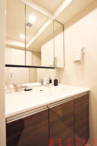 独立洗面台は人気の三面鏡。