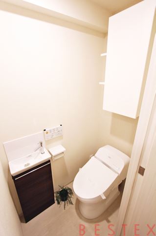 トイレはタンクレスでして手洗い場搭載。