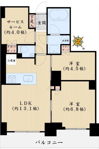 リビング横の居室は約6.8帖で振り分けタイプの使いやすい間取りとなっております。キッチン横の居室は約4.5帖で少し小振りなので、リモートワークや作業部屋としても利用できます。玄関近くのサービスルームは約4帖となっております。